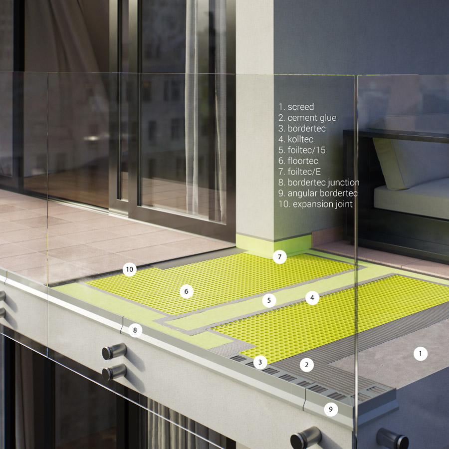 To complete the system, BORDERTEC perimeter profiles for balconies are available, which serve to preserve the edge of the tiles, to protect the screed from water infiltration and to prevent water from running from the edge of the tile and then entering the glue layer and, from there, into the screed.