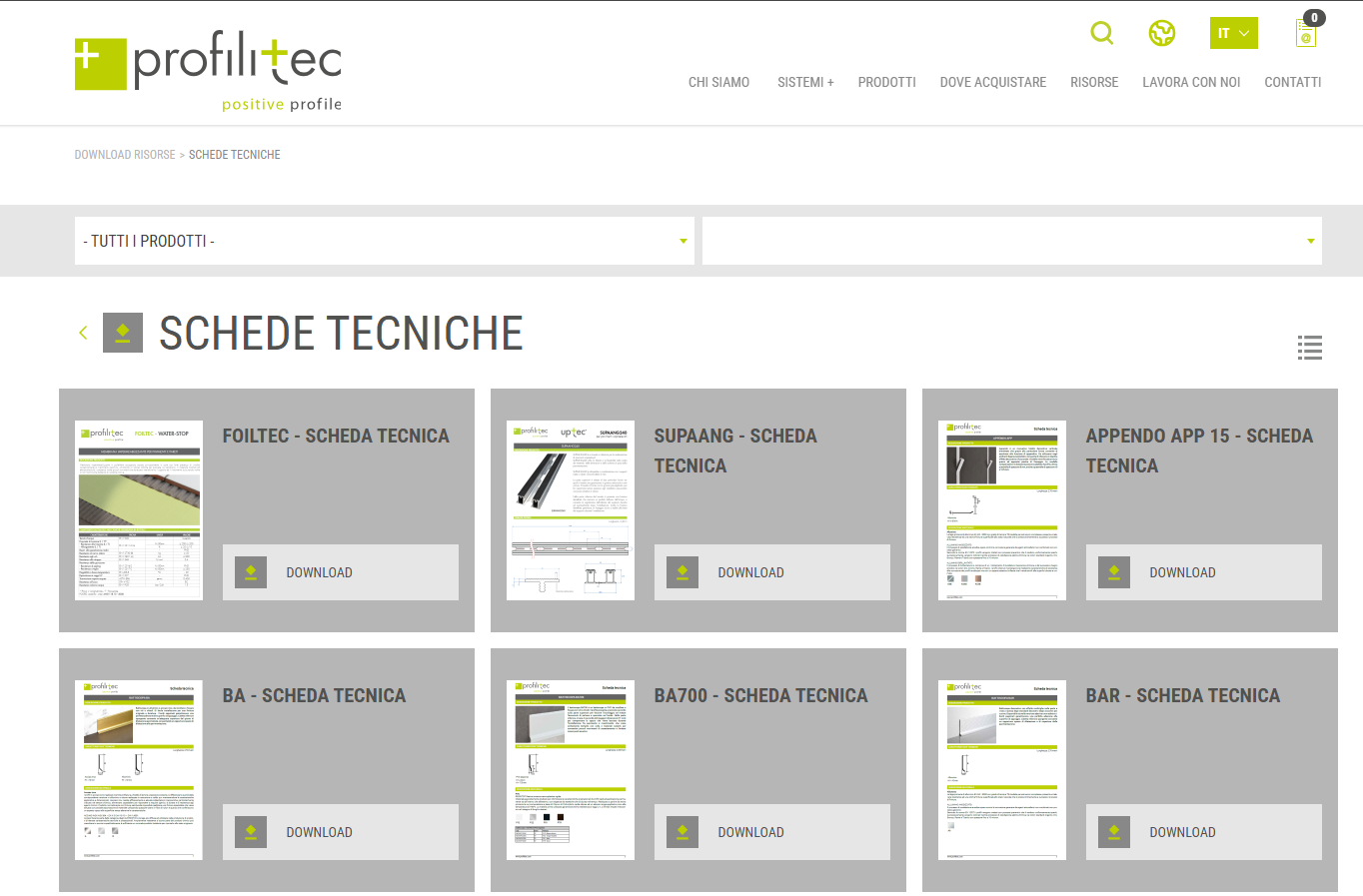 - direttamente all'interno di ogni singola PAGINA PRODOTTO, nella sezione dedicata ai download e alle schede tecniche a fondo pagina.